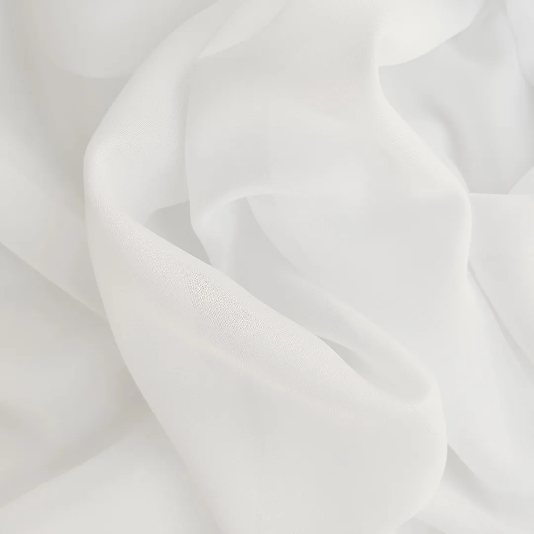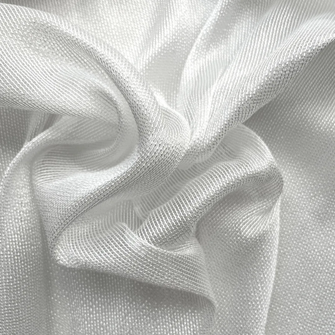 Materiał firanowy o delikatnym połysku, transparentny. Elegancki, jednolity splot i wysoka odporność na zagniecenia.