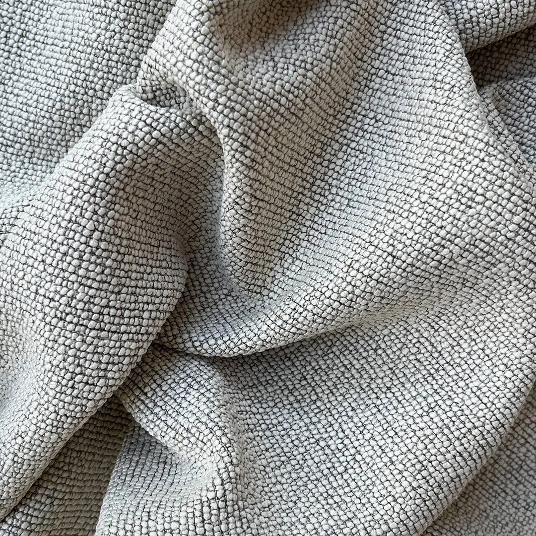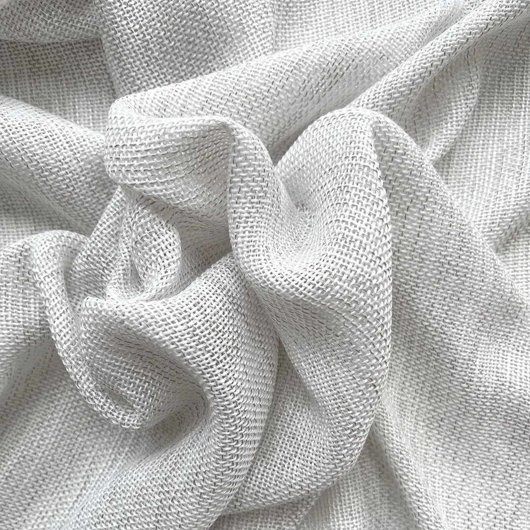 Miękka w dotyku, szaro-beżowa tkanina o melanżowym splocie, półtransparentna. Trwała, odporna na zagniecenia – idealna do nowoczesnych, minimalistycznych aranżacji.