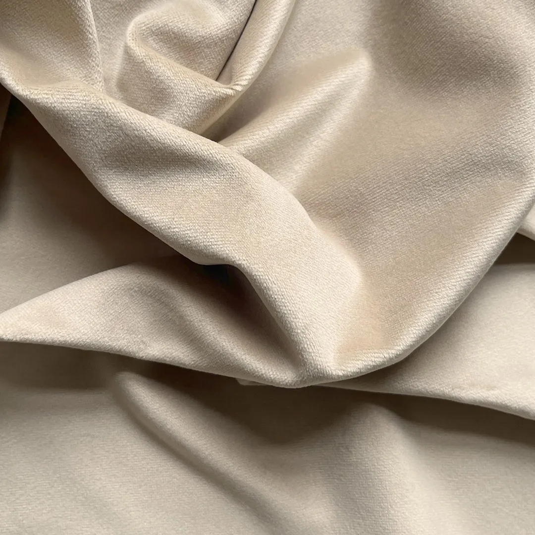 Welwetowa tkanina zasłonowa w ciepłym odcieniu beżu, zaciemniająca. Delikatny połysk i wyjątkowa miękkość nadają wnętrzu charakter premium.